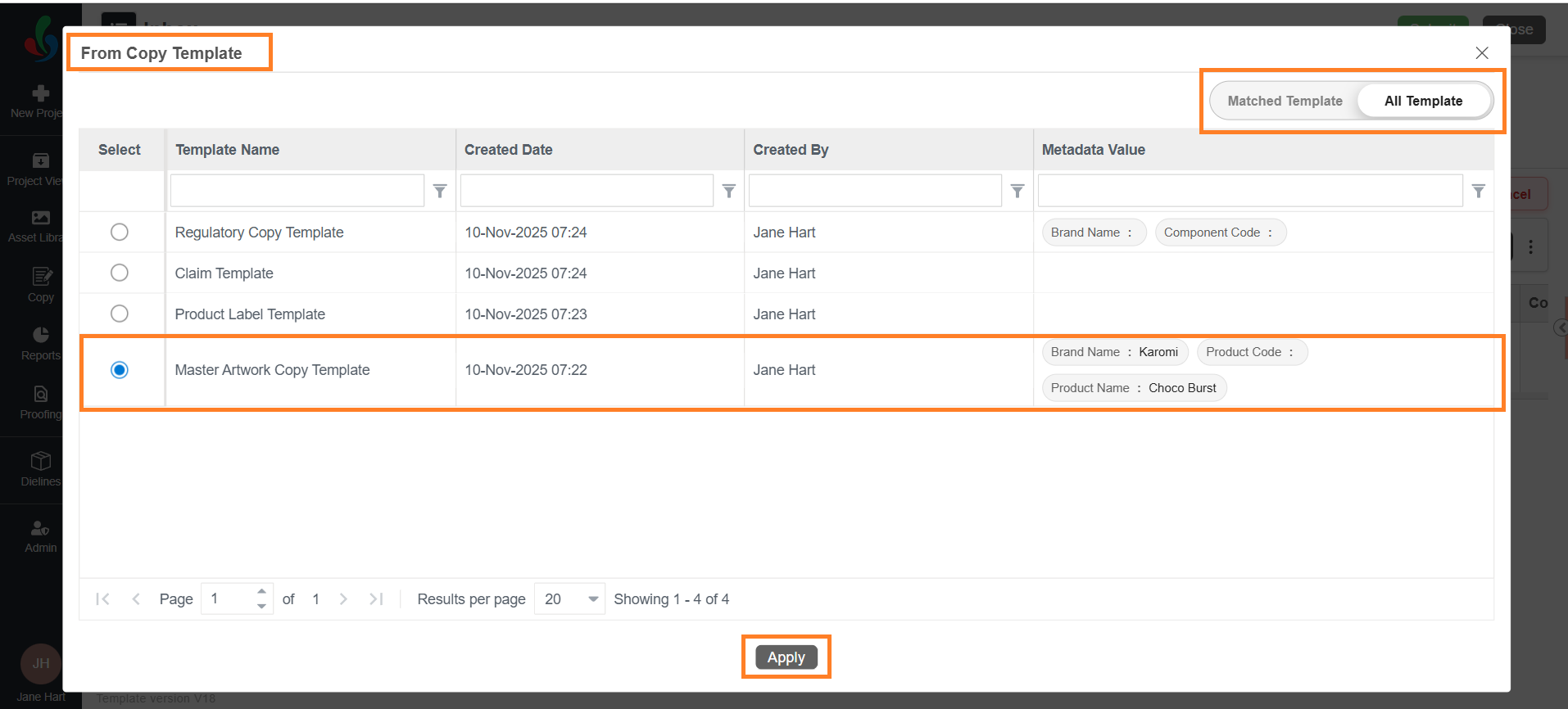 - To view only templates whose configured metadata matches the project, select Matched Templates.