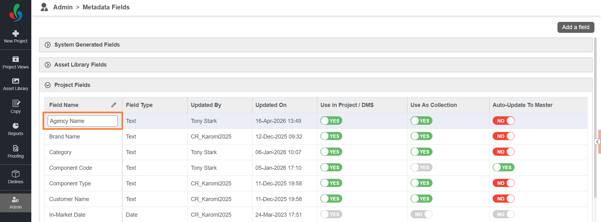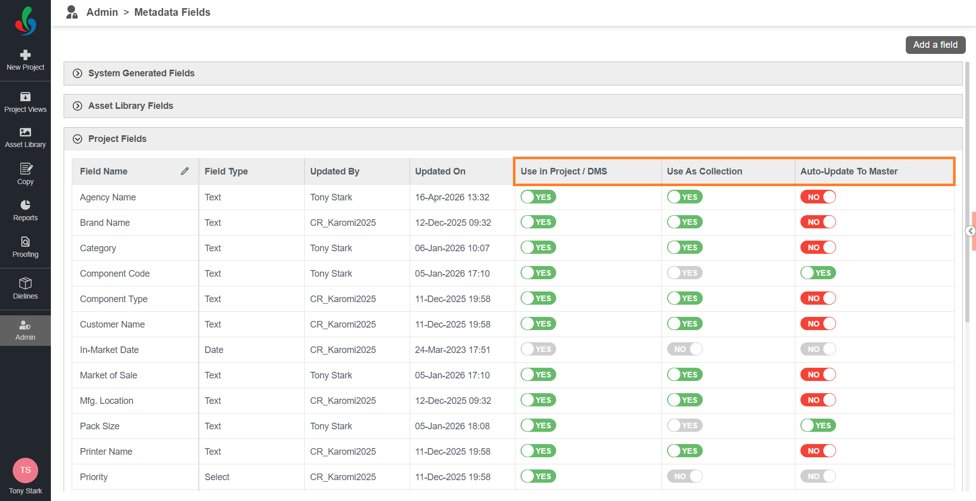 | Note: If Use in Project / DMS is set to YES and the field is already used in uploaded assets or project(s), you cannot change it to NO. This ensures data consistency and prevents loss of associated metadata. |