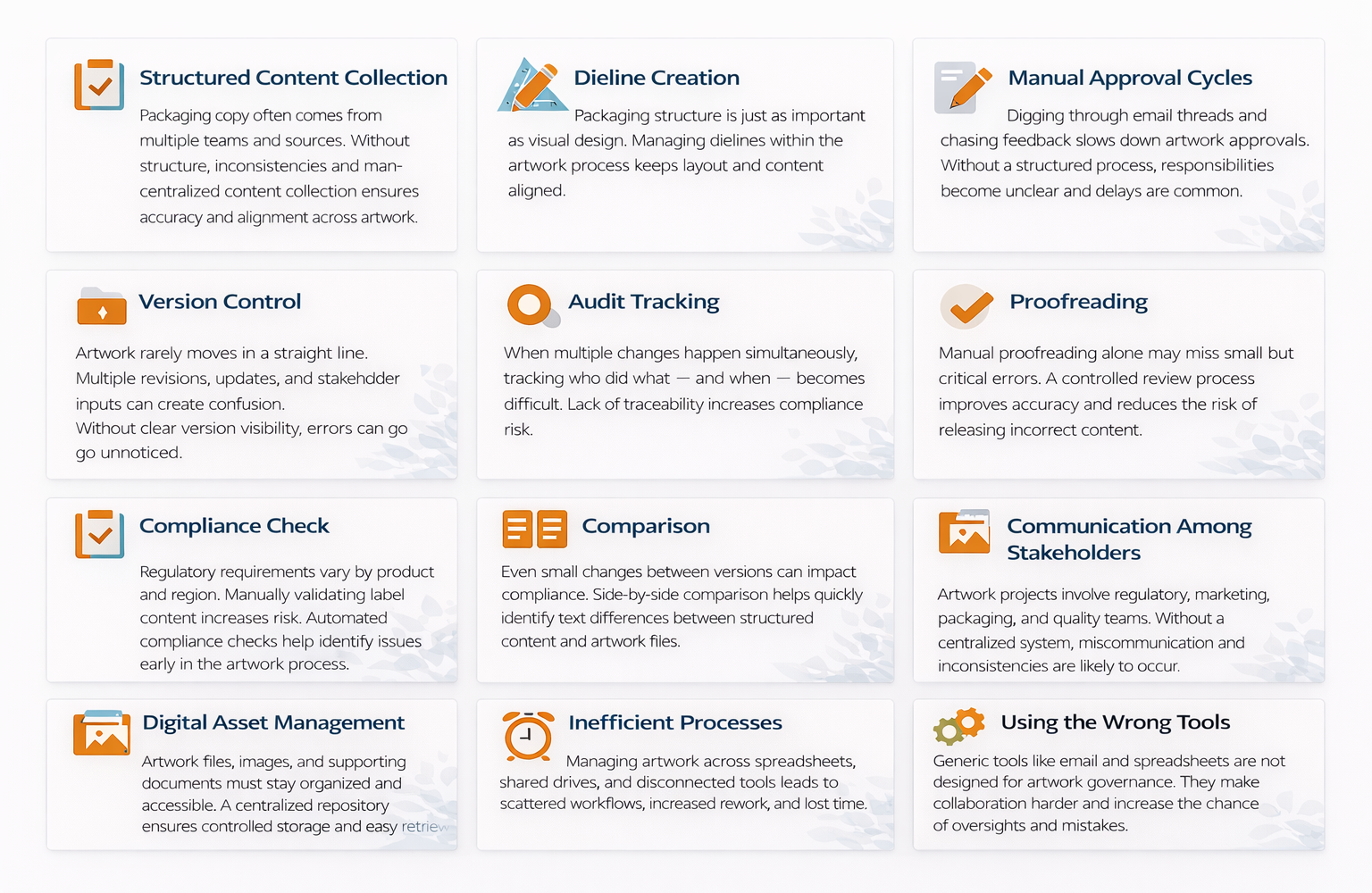 Packaging artwork in regulated industries is inherently complex. It involves multiple stakeholders, frequent content updates, regulatory compliance requirements, barcode validation, version comparisons, structural layout management, and multi-level approvals. When managed through disconnected tools such as emails, shared drives, spreadsheets, and manual review cycles, this complexity often leads to delays, errors, and compliance risks.