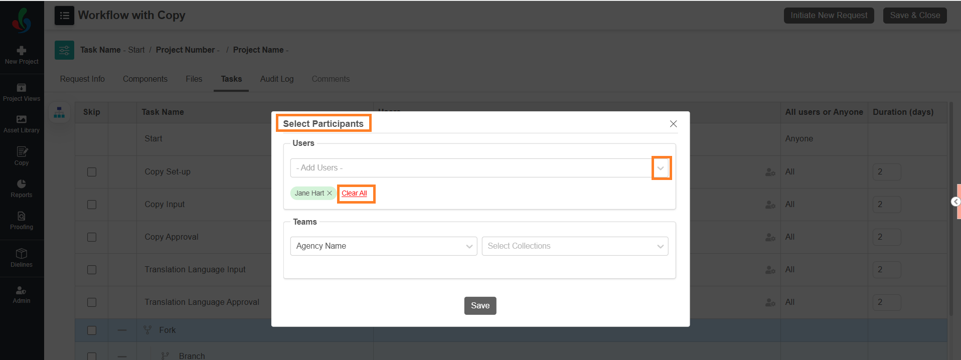 Select the User Settings icon for the required task. The Select Participants pop-up opens.