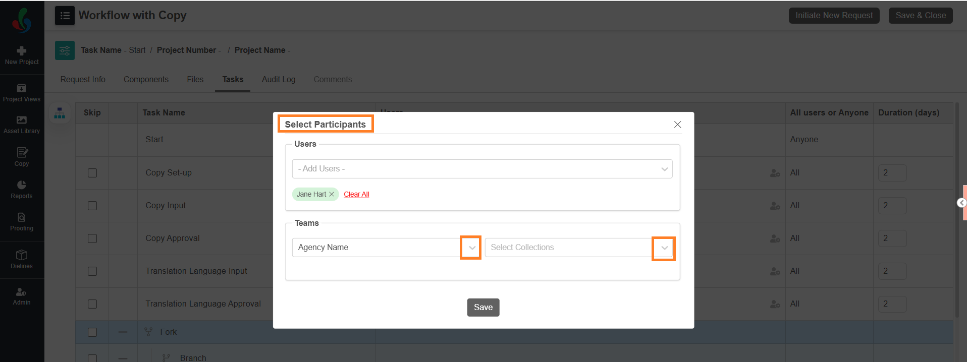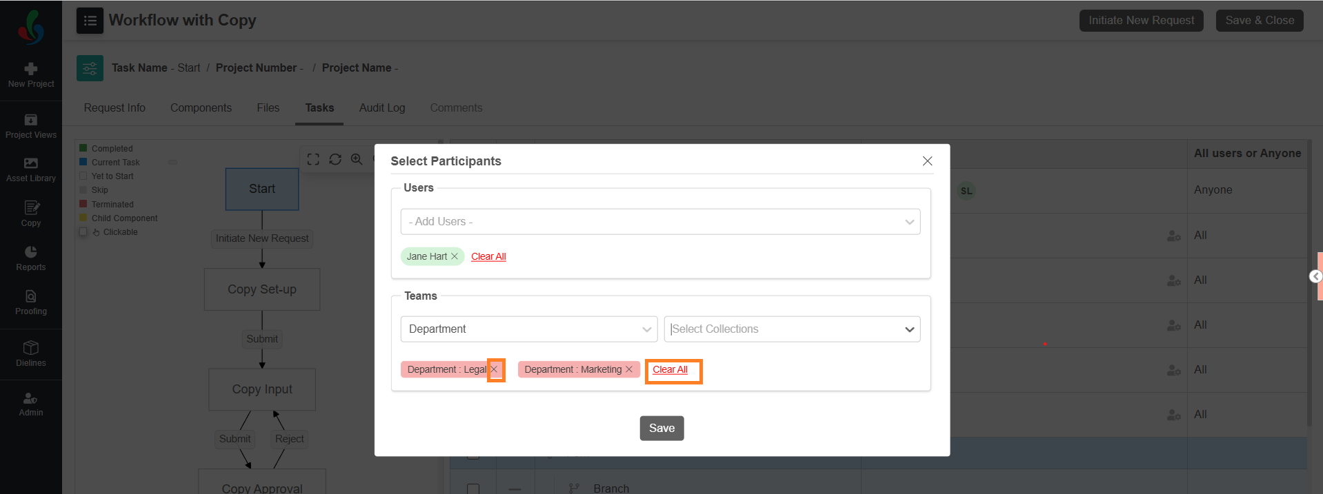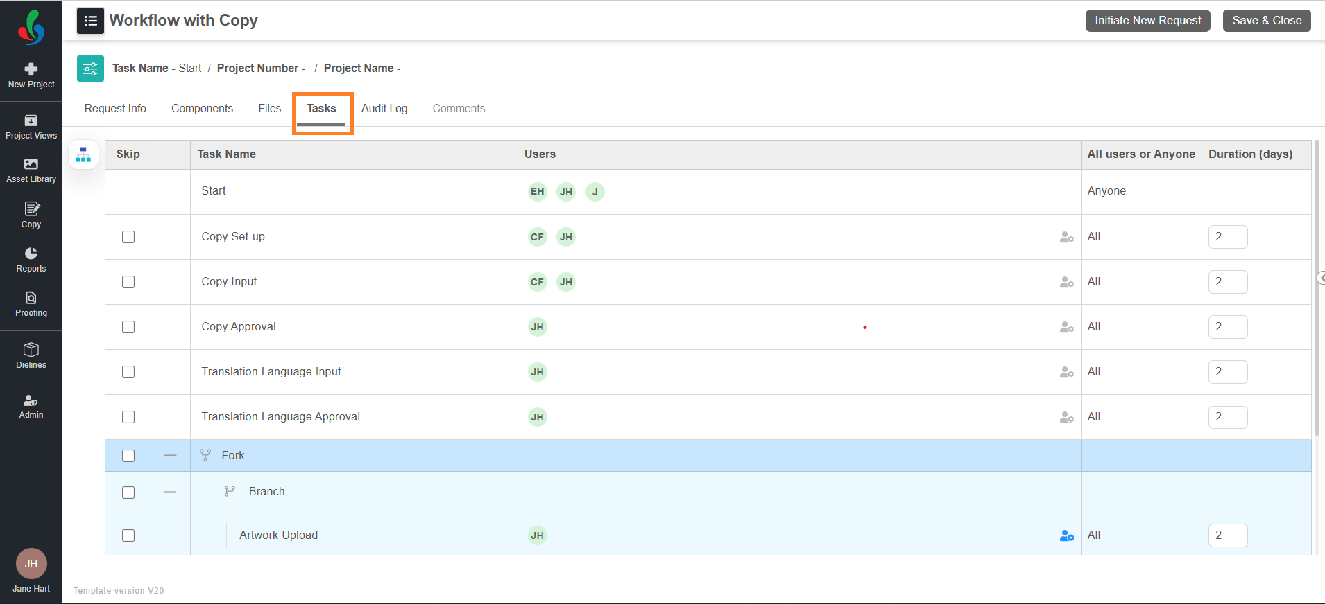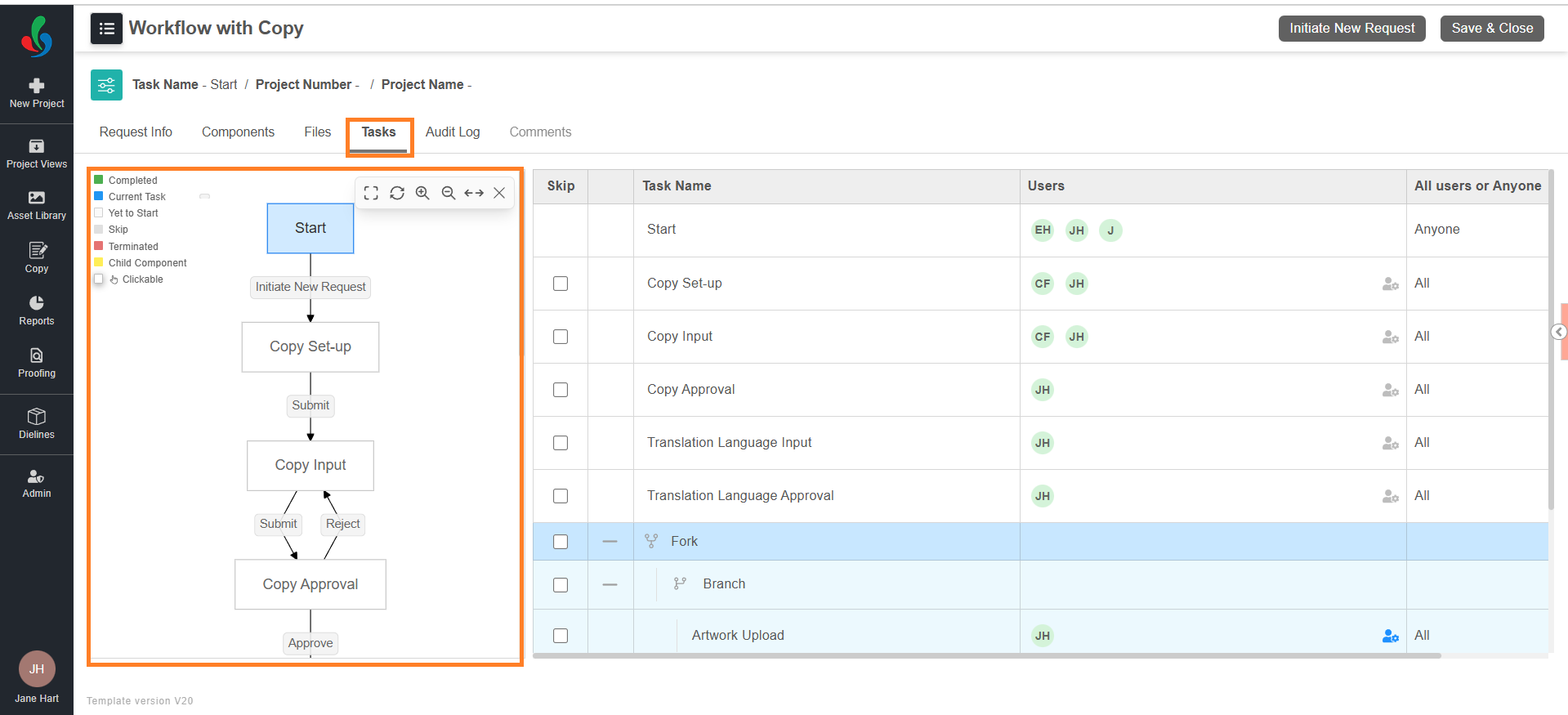 | Note: The Copy tab is applicable only when Copy Manager is enabled for the selected workflow template. The tab becomes visible only after the project is initiated. For more information, refer to Copy Manager Workflow. |