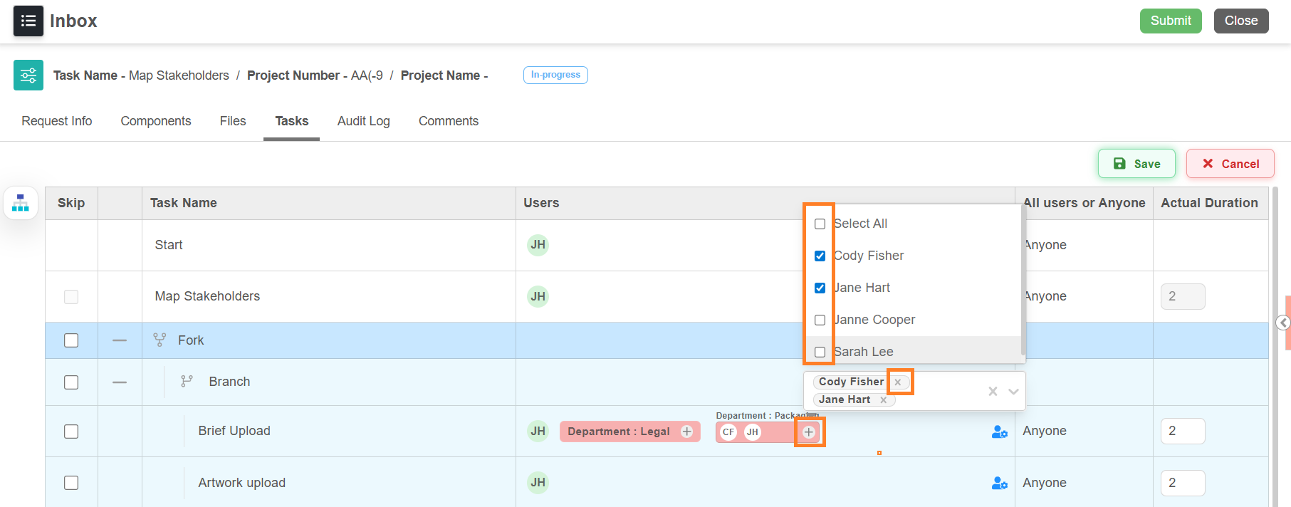 The Tasks tab displays all activities associated with the project. From this tab, you can assign users or teams, modify task durations, and skip tasks as required. The tab also provides a Pictorial View of the project, allowing you to visually track task status and project progress. Default user assignments and durations inherited from the workflow template can be updated, except for the Start activity.